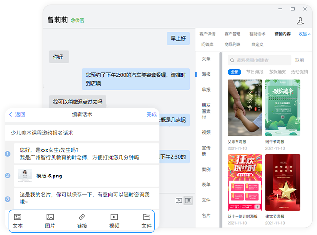 支持图片、链接、视频等多种辅销工具,规范销售话术与资料